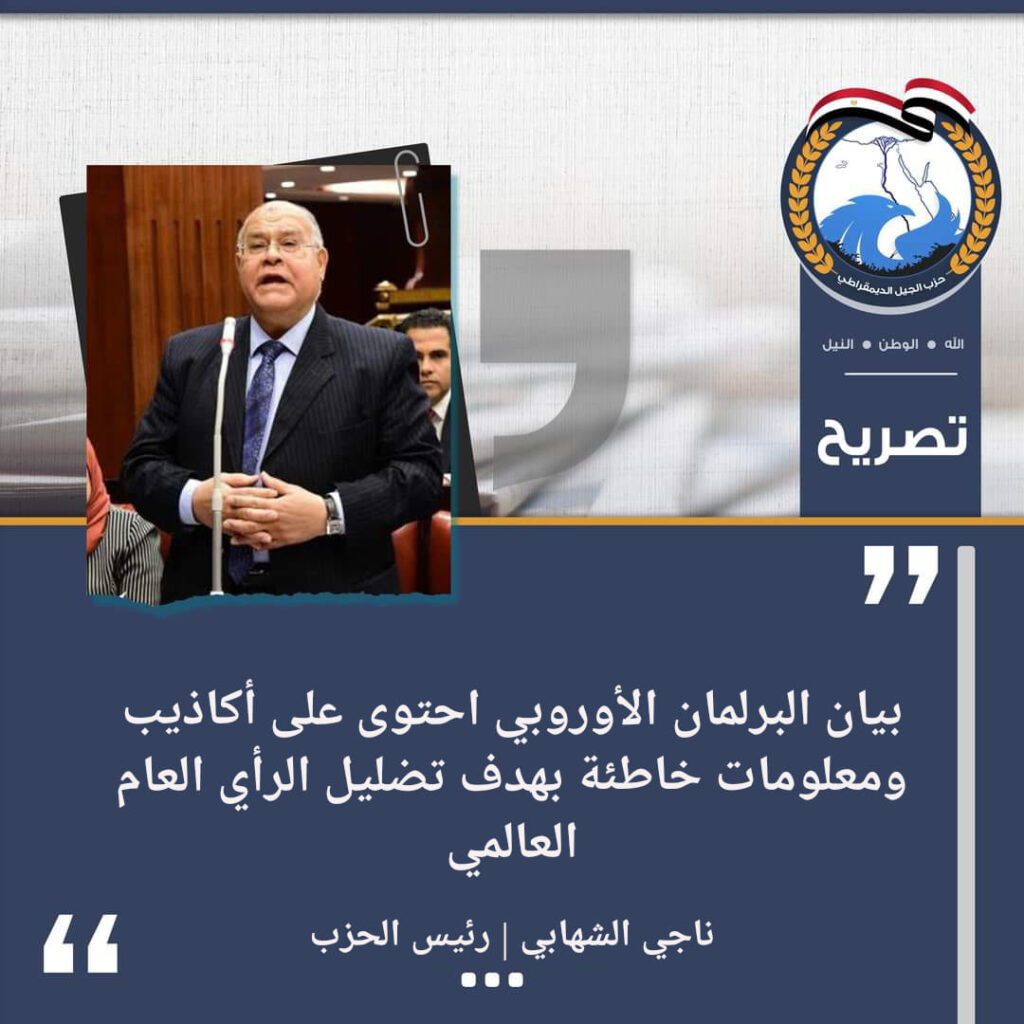ودعا ناجى الشهابي رئيس حزب الجيل الديمقراطى، البرلمان الأوروبى إلى الامتناع عن التدخل فى الشئون الداخلية لمصر وأن يهتم بأمور المواطن الأوروبى وحقوقه المنتهكة والذى يعانى بالفعل من تضييق فى ممارسته لحقه فى الحرية والتعبير والتظاهر.