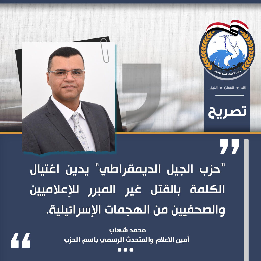 أدان محمد شهاب أمين الإعلام والمتحدث الرسمى باسم حزب الجيل الديمقراطى الهجمات غير المبررة علي الإعلاميين والصحفيين ممن يقومون بالتغطية الصحفية والإخبارية ونقل الأحداث في قطاع غزة والذين استشهدوا خلال استهدافهم بشكل مباشر بصواريخ الاحتلال الإسرائيلي، أو جراء هدم المنازل فوق رؤوسهم هم وعائلاتهم».