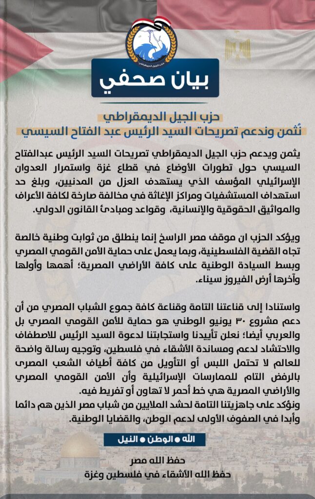 يثمن ويدعم حزب الجيل الديمقراطي تصريحات السيد الرئيس عبدالفتاح السيسي حول تطورات الأوضاع في قطاع غزة واستمرار العدوان الإسرائيلي المؤسف الذي يستهدف العزل من المدنيين، وبلغ حد استهداف المستشفيات ومراكز الإغاثة في مخالفة صارخة لكافة الأعراف والمواثيق الحقوقية والإنسانية، وقواعد ومبادئ القانون الدولي.