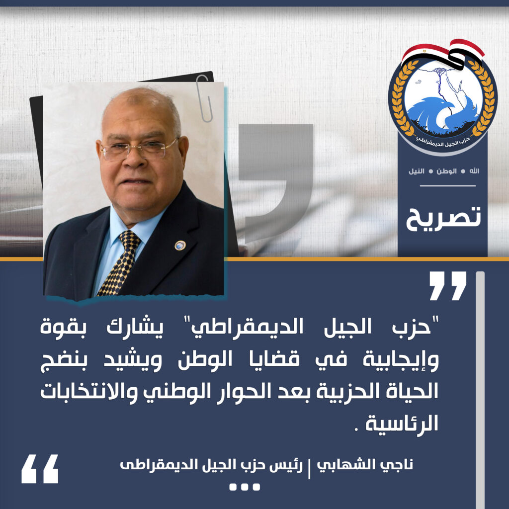 وأكد ناجى الشهابي أن حزب الجيل سيستمر فى أداء دوره الوطنى داعما الدولة المصرية وقائدها المنتخب وخاصة فى كل القضايا التى تتعلق بالأمن القومى للبلاد وسيواصل دوره فى تحصين جماهير شعبنا العظيم من كل المخططات التى تستهدف النيل من تماسك جبهتنا الداخلية منوها إلى أن حزب الجيل شارك بإيجابية وفاعلية فى جلسات الحوار الوطنى وقدم رؤيته فى كل القضايا ال 113 التى قررها مجلس الأمناء من خلال لجانه النوعية التى يقودها شباب متعلم وواع وحاصل على أعلى الدرجات العلمية ويعمل بالفعل فى دولاب الدولة المصرية أى متسلح بالعلم والمعرفة والخبرة الميدانية .