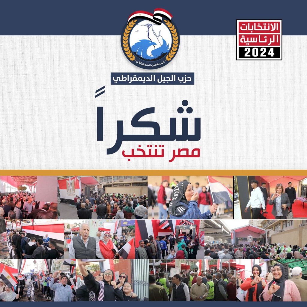 يتقدم حزب الجيل الديمقراطي بخالص الشكر والتقدير لجموع الشعب المصري العظيم علي مشاركتهم الإيجابية في الانتخابات الرئاسية، ووعيهم وروحهم الوطنية، والحفاظ علي حقهم الذي كفله لهم الدستور وقانون مباشرة الحقوق السياسية، في الإدلاء برأيهم في العملية الانتخابية، وأن هذه المشاركة الشعبية تدل على الوعي بحجم التحديات التي تواجه الدولة المصرية محليا ودوليا، كما أن المشاركة الشعبية الكبيرة في الانتخابات الرئاسية على مدار الثلاثة أيام الدرس الحقيقي للجميع، بما يثبت الوعي الكامل بالتحديات التي يمر بها الوطن في المرحلة الراهنة، وما يعكس إدراك الشعب المصري العظيم بالحفاظ على مقدرات وطنه والاصطفاف الدائم خلف وطنهم من أجل استكمال مسيرة البناء والتنمية، حيث إن هذا المشهد المهيب يعكس المظهر الحضاري العظيم الذي يصنعه المصريون بكل ما لديهم من قوة في كافة الاستحقاقات السياسية ويؤكد أن الوطن يحيا بشعبه