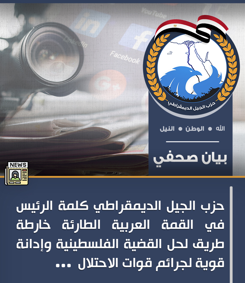 10 أكتوبر، 2024مقالات حزب الجيل الديمقراطى :كلمة الرئيس في القمة العربية الطارئة خارطة طريق لحل القضية الفلسطينية وإدانة قوية لجرائم قوات الاحتلال.