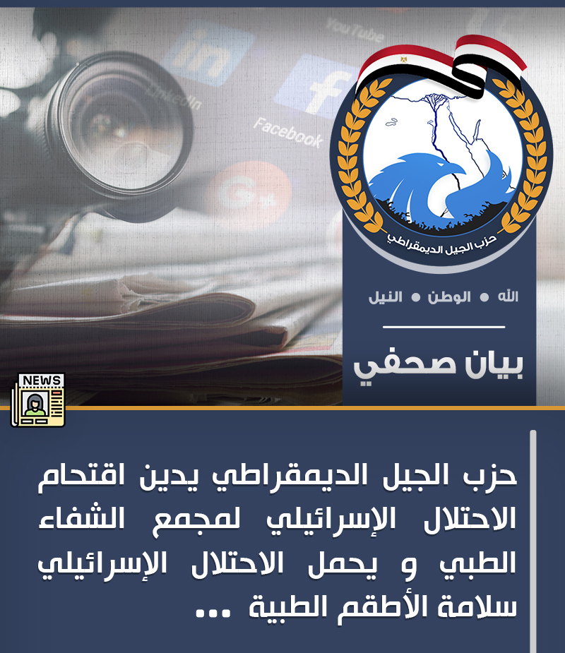 10 أكتوبر، 2024مقالات حزب الجيل الديمقراطي يدين اقتحام الاحتلال الإسرائيلي لمجمع الشفاء الطبي و يحمل الاحتلال الإسرائيلي سلامة الأطقم الطبية.