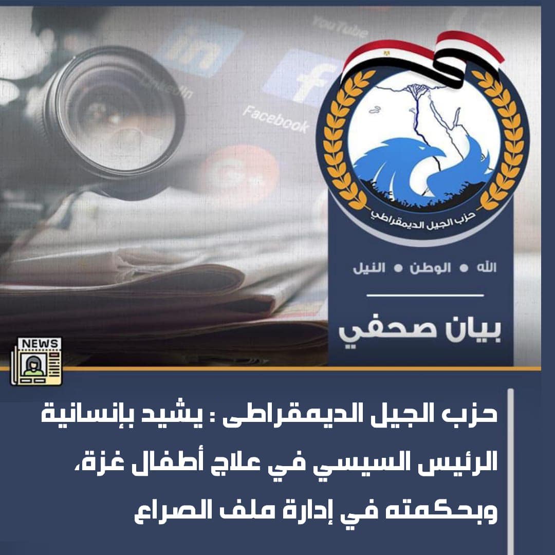 10 أكتوبر، 2024مقالات حزب الجيل الديمقراطى يشيد بإنسانية الرئيس السيسي في علاج أطفال غزة، وبحكمته في إدارة ملف الصراع