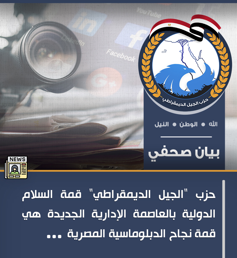 10 أكتوبر، 2024مقالات حزب الجيل الديمقراطى :قمة السلام الدولية بالعاصمة الإدارية الجديدة هي قمة نجاح الدبلوماسية المصرية .