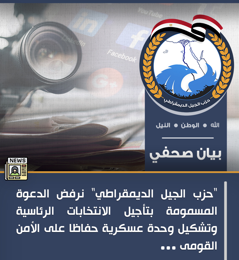 9 أكتوبر، 2024مقالات حزب الجيل الديمقراطى : نرفض الدعوة المسمومة بتأجيل الانتخابات الرئاسية وتشكيل وحدة عسكرية حفاظا على الأمن القومى