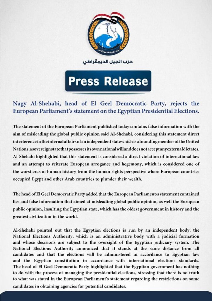 Nagy Al-Shehabi, called on the European Parliament to refrain from interfering in Egypt’s internal affairs and to pay attention to the affairs of the European citizen whom are already suffering from restrictions in exercising their right to freedom of expression, freedom of religious practices and their right to peaceful demonstrations