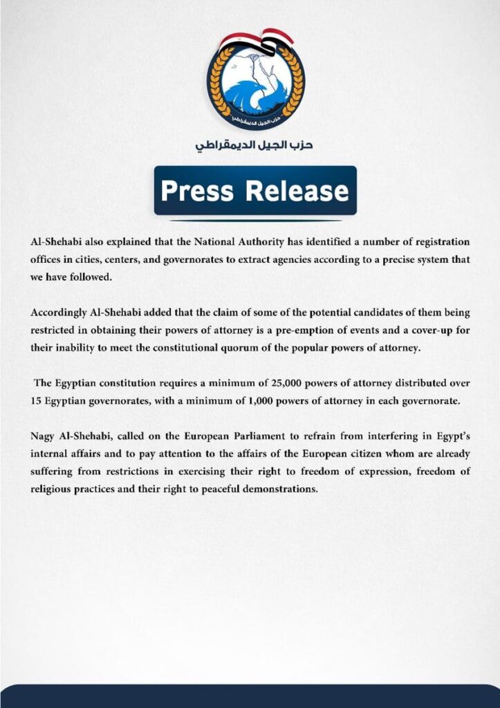 Accordingly Al-Shehabi added that the claim of some of the potential candidates of them being restricted in obtaining their powers of attorney is a pre-emption of events and a cover-up for their inability to meet the constitutional quorum of the popular powers of attorney. The Egyptian constitution requires a minimum of 25,000 powers of attorney distributed over 15 Egyptian governorates, with a minimum of 1,000 powers of attorney in each governorate.